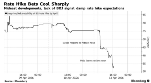 Bank of Japan (BOJ) akan menggelar pertemuan kebijakan berikutnya pada 27-28 April 2026. Sebelumnya, pasar memperkirakan peluang kenaikan suku bunga berada di kisaran 60–70%, didorong oleh inflasi yang bertahan tinggi, kenaikan upah, serta pelemahan yen. Namun, ekspektasi berubah setelah Gubernur BOJ, Kazuo Ueda menekankan tingginya ketidakpastian global, khususnya terkait konflik AS–Iran dan pergerakan harga minyak, mendorong pasar untuk lebih berhati-hati. Akibatnya, probabilitas kenaikan suku bunga pada April kini turun ke sekitar 30%, mencerminkan pergeseran sikap BOJ ke arah wait and see.